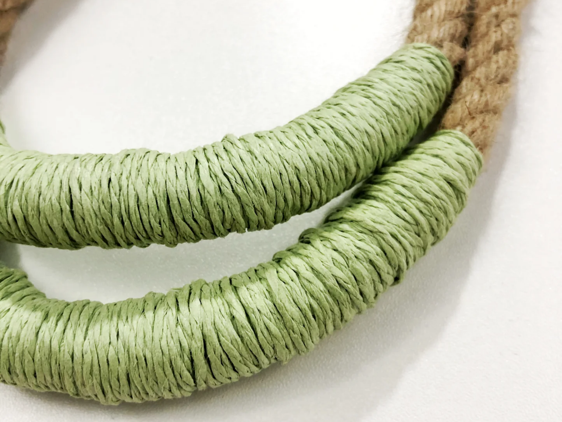 - Handmade with raffia yarn / Wood button closure / Wrapped rope handle