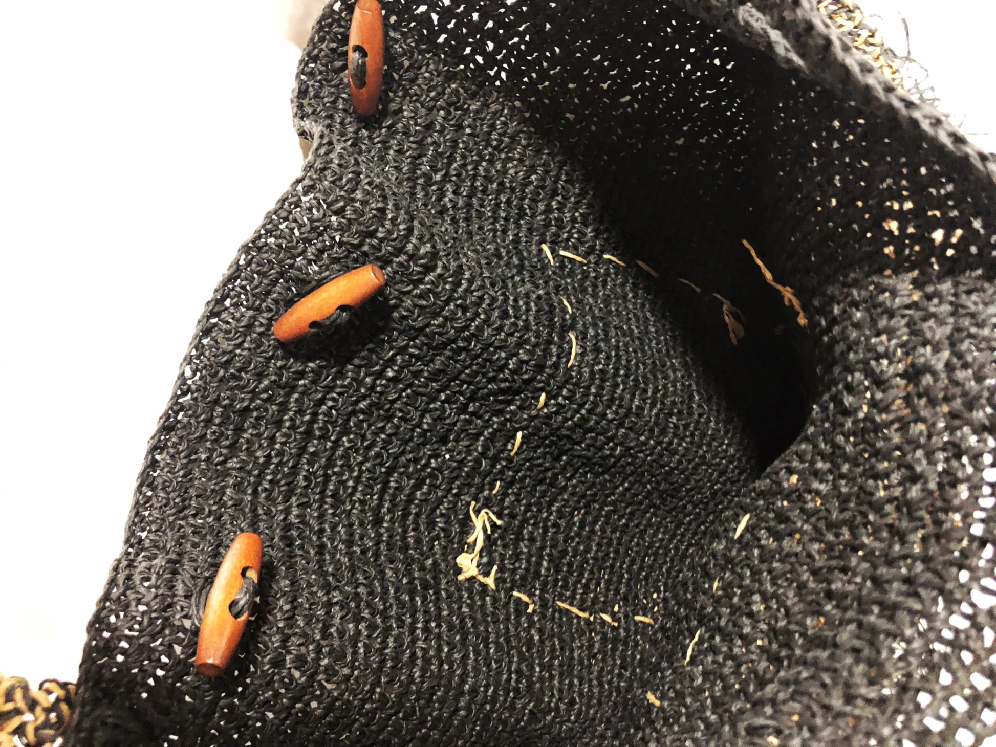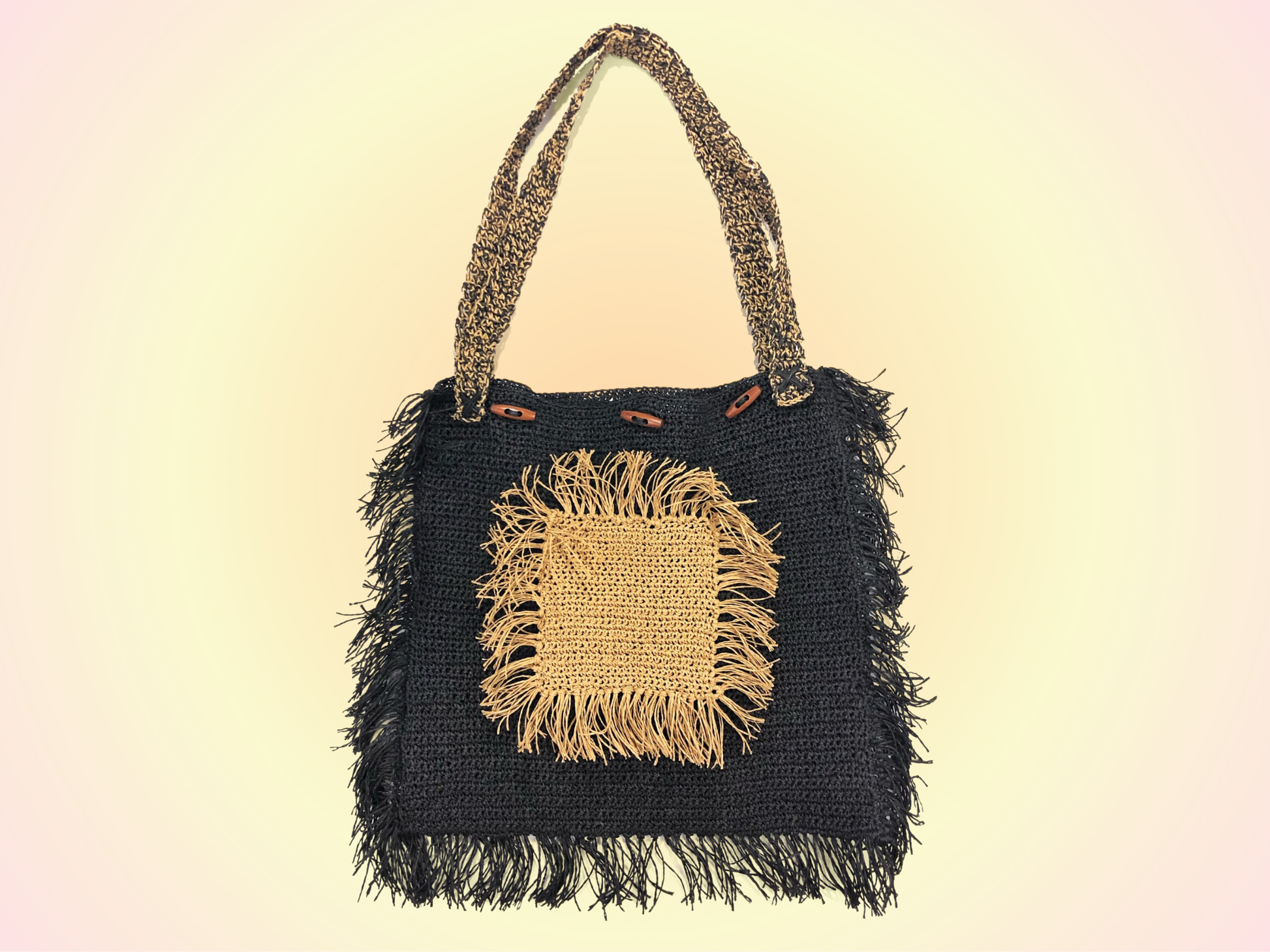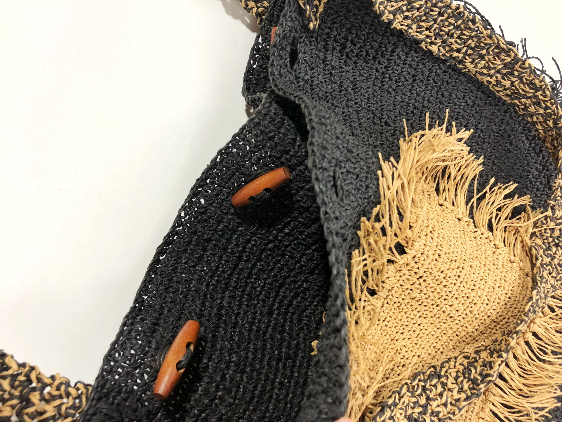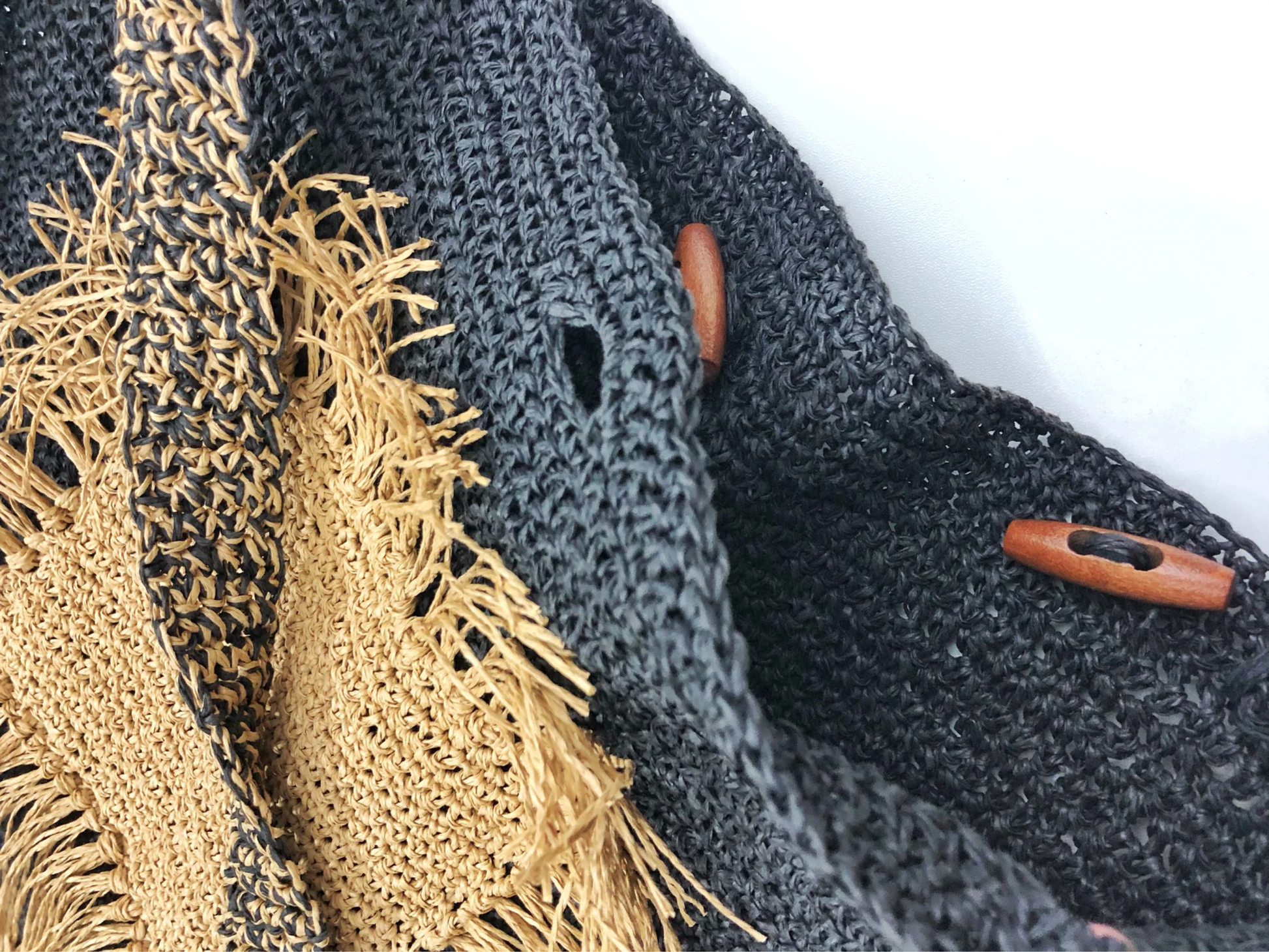 - Handmade with raffia yarn / Wooden button closures