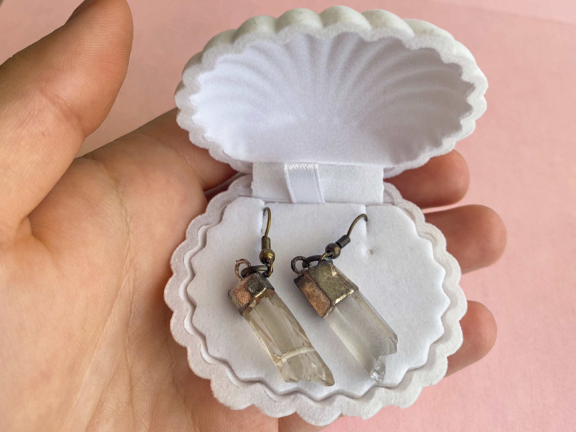 Feel yourself in these gorgeous quartz crystal earrings. Inspired by summertime & beachy aesthetics. Each pair comes packed with love in a cute seashell gift box.