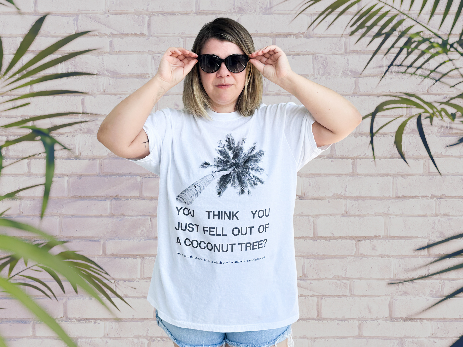 Elevate your wardrobe with our "You Think You Just Fell Out of a Coconut?" T-shirt, inspired by the viral meme that's popular up on TikTok. This trendy tee combines humor and style, making it a perfect choice for meme lovers and self expression. The design features a POV photo looking up at a palm tree with the quote "You think you just fell out of a coconut tree?" and in smaller text below it says "You exist in the context of all in which you live and what came before you."